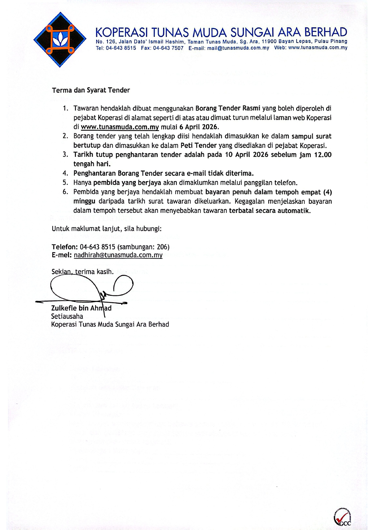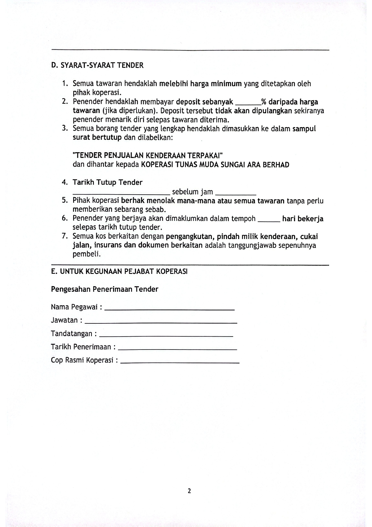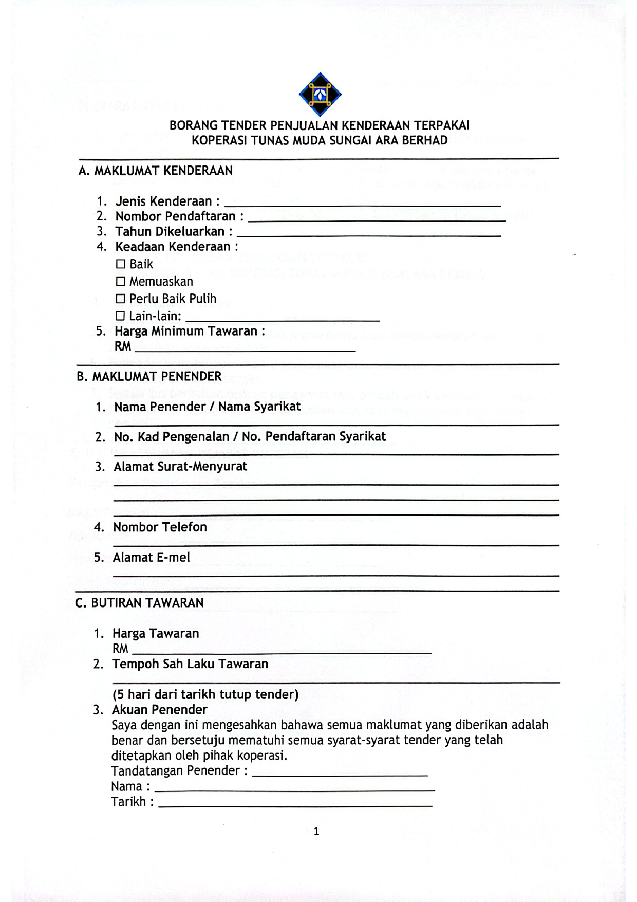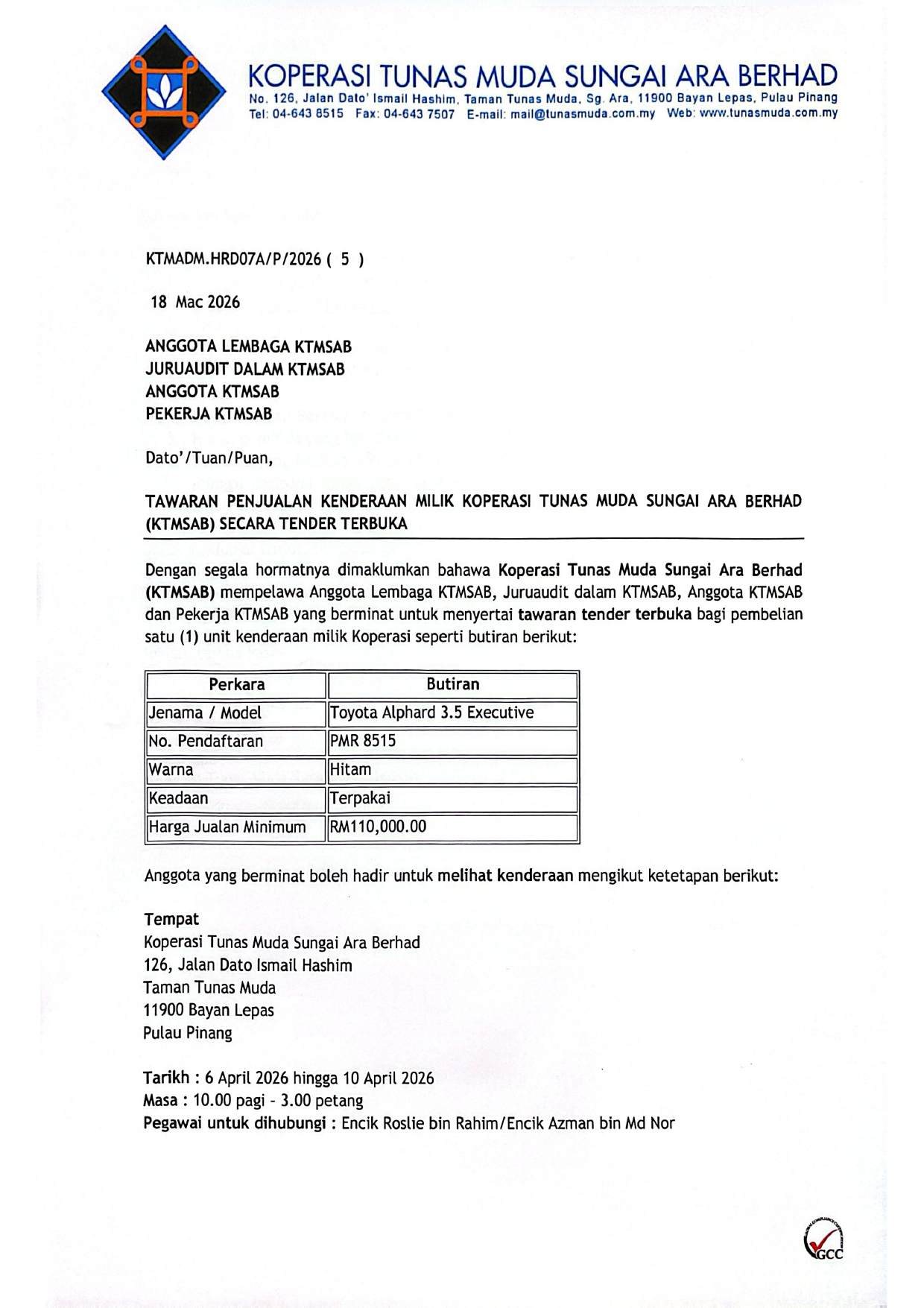 TAWARAN PENJUALAN KENDERAAN MILIK KOPERASI TUNAS MUDA SUNGAI ARA BERHAD (KTMSAB) SECARA TENDER TERBUKA.
